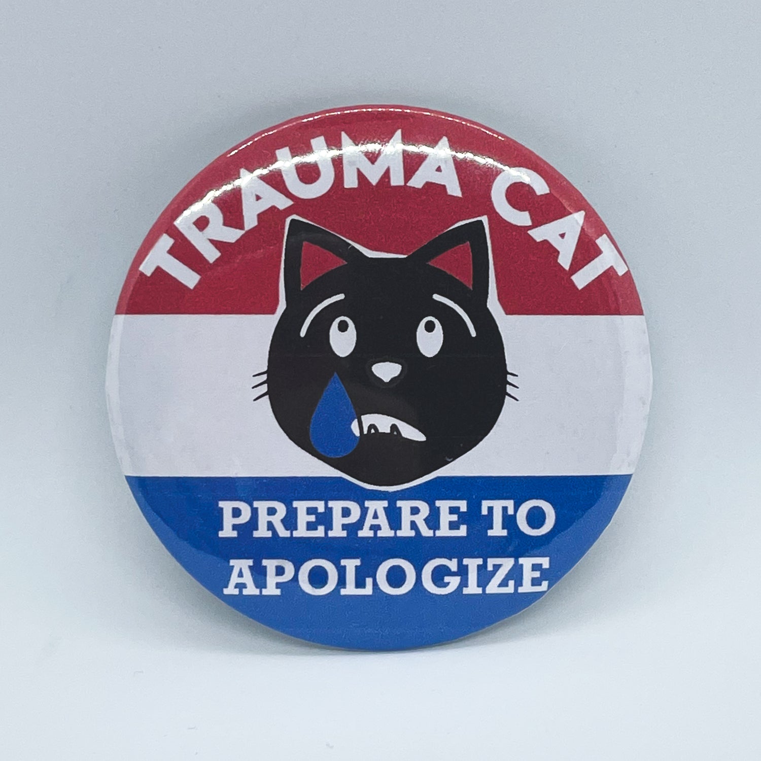 All Trauma Cat Prepare to Apologize era button pins are 2" x 2" and feature a red-white-and-blue color scheme, so when you wear one of these babies, you'll be mistaken for a politically engaged individual. The idea here? You attract the discussion of potential debate partners, donors, or party affiliates, only for them to say, "Wait a minute, what's Trauma Cat?" And then, well... it's called brand awareness. Sorry for the candor! Choose from three designs. 😿